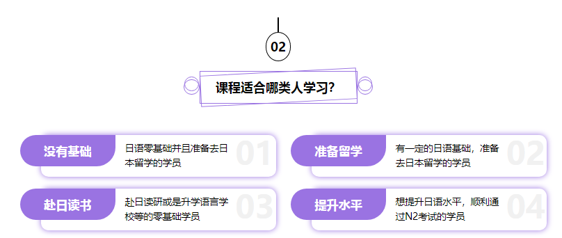 日語(yǔ)零基礎(chǔ)或稍有基礎(chǔ),想要系統(tǒng)學(xué)習(xí)日語(yǔ)的同學(xué);希望通過(guò)N1考試的同學(xué);想去日本旅游、留學(xué)、工作,希望可以用日語(yǔ)交流溝通的同學(xué);想進(jìn)入日企工作,或者已經(jīng)在日企希望通過(guò)提高日語(yǔ)水平獲得升職加薪的同學(xué)。