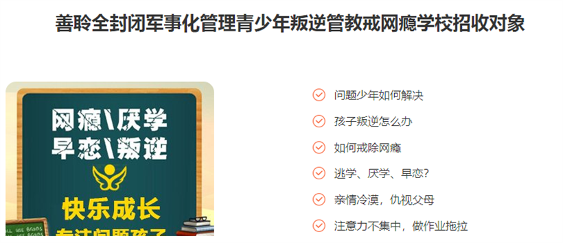 善聆專業(yè)從事問題青少年心理教育、行為教育、感恩教育及文化教育的專門機(jī)構(gòu),專注解決孩子厭學(xué)輟學(xué)、早戀叛逆、離家出走、焦慮恐懼、強(qiáng)迫狂躁、網(wǎng)癮宅居、多動(dòng)好斗、小偷小摸、暴力打架、混跡社會(huì)等青少年成長中的問題。針對(duì)13-18周歲孩子存在網(wǎng)癮、叛逆、厭學(xué)、早戀、離家出走等青少年成長問題進(jìn)行心理輔導(dǎo)、思想教育、行為矯正、素質(zhì)培養(yǎng)和文化補(bǔ)習(xí)的叛逆孩子行為矯正學(xué)校。善聆勵(lì)志青少年叛逆學(xué)校全封閉式管理,準(zhǔn)軍事化教學(xué),面向全國招生,隨到隨學(xué),入學(xué)簽訂合同,效果保證。
