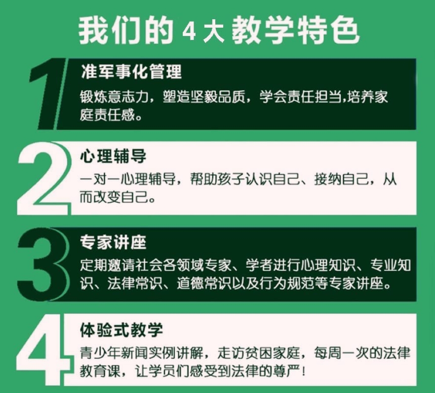 4、致勝叛逆勵志教育學(xué)校:針對8歲-18歲的早戀、網(wǎng)癮、厭學(xué)、叛逆、懶惰、親情淡漠、離家出走、自控能力差等不良習(xí)慣的青少年,進(jìn)行心理輔導(dǎo)、軍事訓(xùn)練、感恩教育、行為習(xí)慣矯正、思想教育、法制教育等。